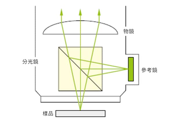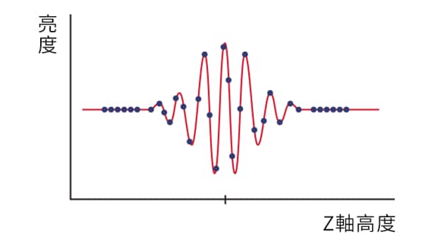 使用光學(xué)干涉儀時,高度解析度不取決於物鏡的倍率,因為即使物鏡的景深很大,代表干涉條紋強(qiáng)度的複合波形也可以透過計算精確地重現(xiàn)。 由於光的波長是固定的,因此光的干涉條紋會以固定的間隔出現(xiàn)。這意味著,如果預(yù)先知道所使用的波長,就可以計算出干涉條紋強(qiáng)度的複合波形會是什麼樣子。 接著,透過從固定間隔擷取的干涉強(qiáng)度重現(xiàn)複合波形圖,並將重現(xiàn)的複合波形分離進(jìn)行處理,進(jìn)而實現(xiàn)高解析度量測。