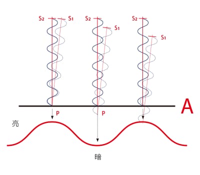 當(dāng)兩道光波碰撞時會發(fā)生光干涉,使彼此相互增強(qiáng)或減弱。本節(jié)將說明兩道光在距離目標(biāo)物表面一定距離處到達(dá)P點時所產(chǎn)生的干涉。如果兩道光路S1P和S2P的距離差是光波長λ的整數(shù)倍,則兩道光波會因波峰重疊而在P點增強(qiáng)並變亮。如果光程差是波長λ的整數(shù)倍加上λ的一半(λ/2),則波峰與波谷會重疊,導(dǎo)致光波減弱並變暗。