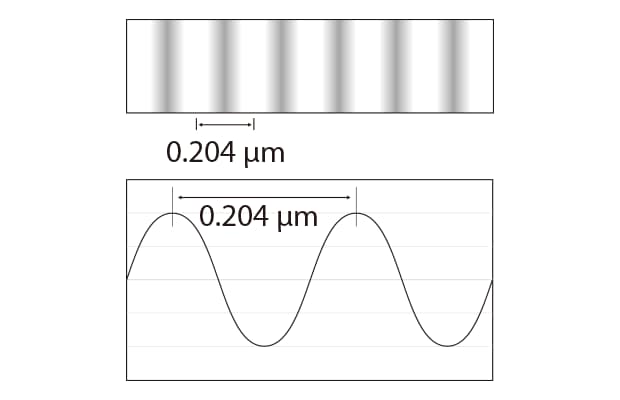 例如,使用408 nm的光源時,干涉條紋的間距(波長)為0.204 μm。 此數(shù)值代表量測表面的高度差。 由於波形圖中波峰到波峰的高度差為0.204 μm,因此透過將波峰之間的波形圖分割為2000個區(qū)段,即可實現(xiàn)0.1 nm的解析度。 光學(xué)干涉儀透過量測規(guī)則干涉條紋的明暗變化來量測高度的變化。