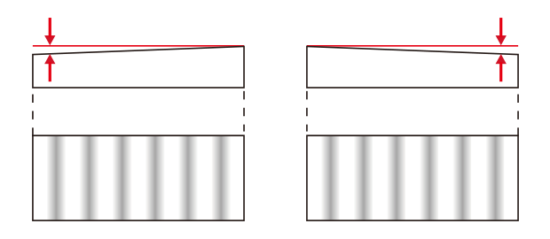 如左圖所示,來自單一波長光源的干涉圖案在上坡和下坡時是相同的,因此無法判斷方向。為了解決這個問題,在物鏡和目標(biāo)物移動光源波長的λ/8(1/8波長)時,擷取四張干涉條紋影像來量測高度。這種量測方法稱為相位移轉(zhuǎn)干涉術(shù)(PSI)。