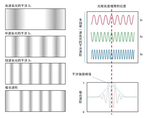 使用白光光源時,在物鏡焦點處的量測表面上,干涉條紋會變得最強(qiáng),而遠(yuǎn)離焦點時則會消失。透過疊加不同波長的干涉條紋所產(chǎn)生的複合波形,可以偵測到干涉強(qiáng)度的峰值。
