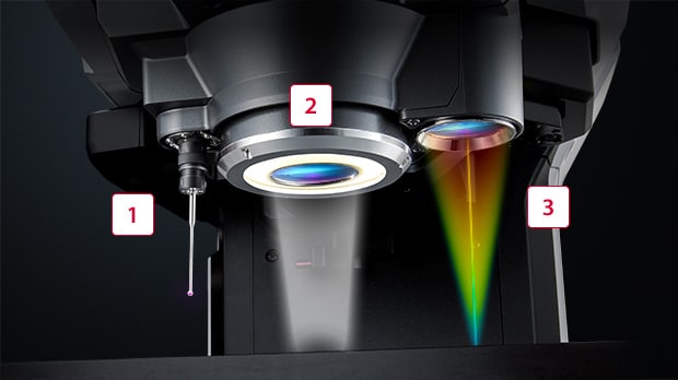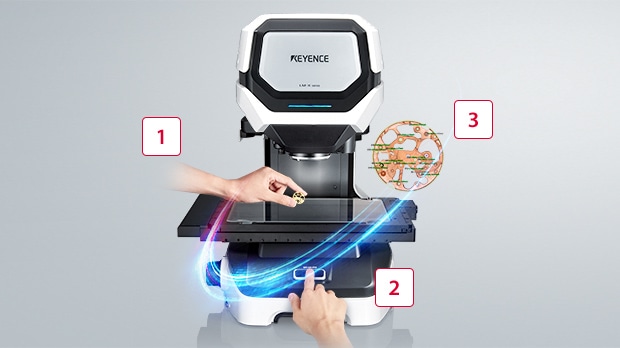 只需將目標(biāo)物置於載物臺(tái)上並按下按鈕的簡(jiǎn)單操作,即可實(shí)現(xiàn)±0.1 μm的高精度量測(cè)。配備3種量測(cè)方式,即高精度影像量測(cè)、利用彩色雷射的非接觸式高度量測(cè)、利用三次元接觸式探測(cè)器的接觸量測(cè)。大幅縮短複雜的量測(cè)目標(biāo)物的尺寸量測(cè)時(shí)間,實(shí)現(xiàn)不含有量測(cè)者誤差的正確量測(cè)。