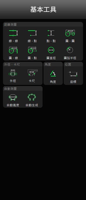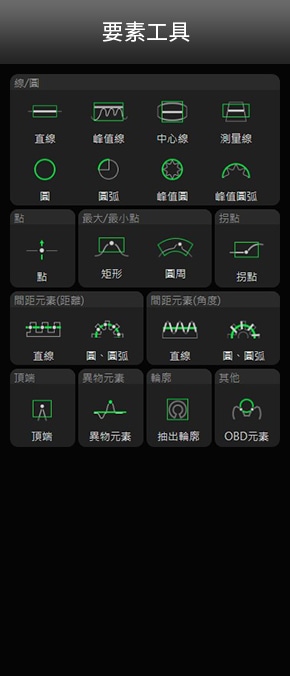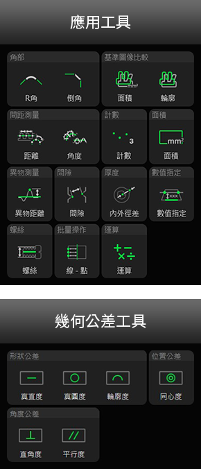 依據(jù)不同的組合方式,備有100多種量測工具。支援尺寸量測、幾何公差量測、基準面積比較、異物距離量測等線上檢測所需的各種量測內(nèi)容。