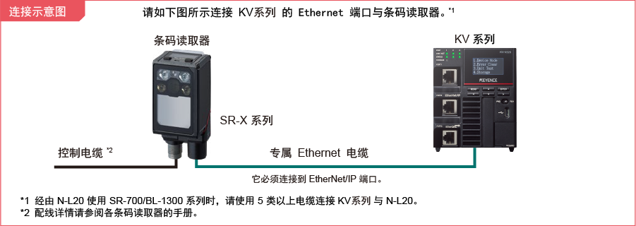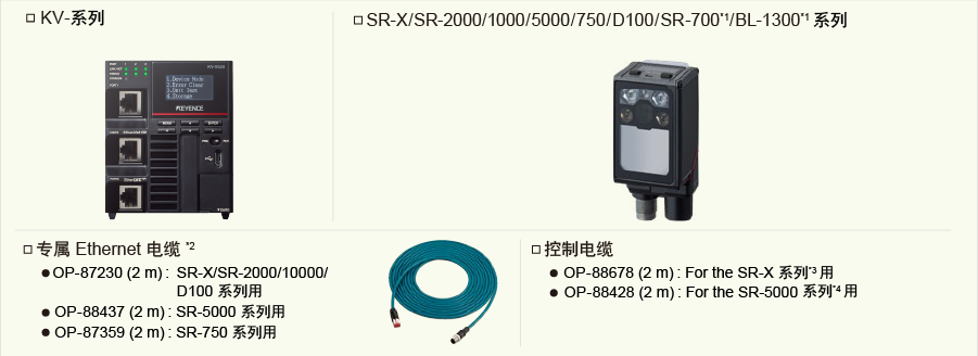 ※1 使用 SR-700/BL-1300 系列時(shí),需要 N-L20(需另外購買)。 ※2 這是連接讀碼器和 PLC 的電纜。使用 N-L20 時(shí)不需要此專用電纜。 ※3 此電纜用於連接 24 V 電源供應(yīng)器、I/O 端子和 RS-232C 連接埠。 ※4 使用 SR-5000 系列時(shí),請使用 OP-88437 或類似的選購電源線。