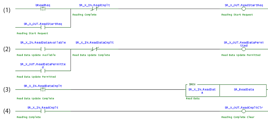 在此程式範(fàn)例中,使用下列 SR-X 系列 裝置指定,讀碼器會被指示以 1 號庫的設(shè)定開始讀取,讀取字串會儲存在 SR_ReadData 中。