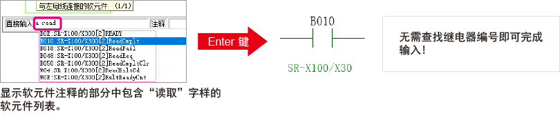 當(dāng)您使用階梯圖程式時(shí),您可以直接將元件註釋或參數(shù)名稱輸入到自動搜索並顯示輸入候選項(xiàng)。