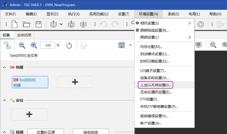 5. 使用乙太網(wǎng)電纜連接 KV-X 系列和 EtherNet/IP 設備後,在 [EtherNet/IP 設定] 視窗中選擇 [檔案(F)] → [自動配置(S)]。